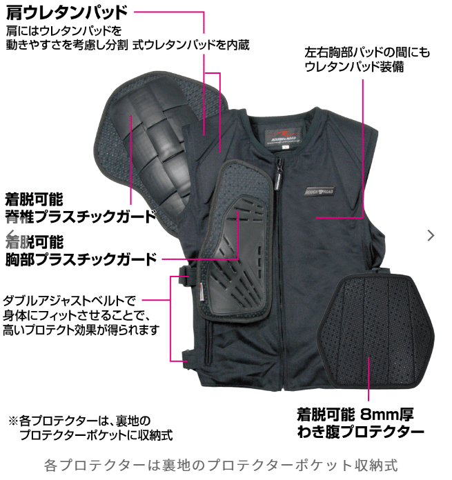 見た目と違って中身はスゴインです! 胸部、脊椎はプラスチックでガード。わき腹にもウレタンパッドを挿入し 上半身をフルカバー。すでに購入済みのプロテクション(肩肘脊椎) ジャケットの下に着込むだけで上半身を隈なくガードします。また、 ジャケットを着込むのが苦痛な夏場などはシャツの上から気軽に羽織 って、急所をプロテクトできます。 ※生産ロットによりロゴマークが変わる場合があります 品番 RR1006...