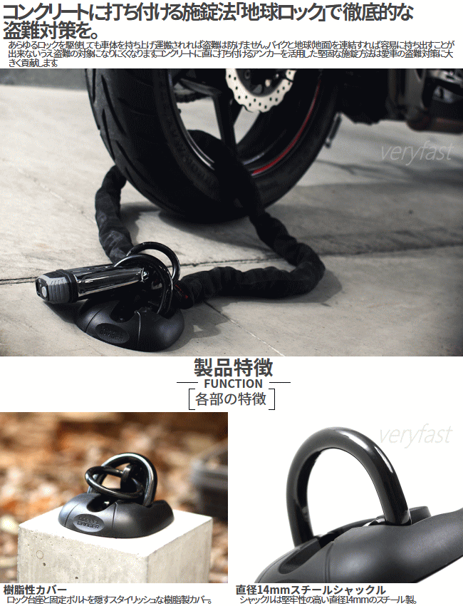 バイク用 施錠 ロック 地球ロック 防犯 施錠対策 盗難対策 アンカー コンクリート打ち付け