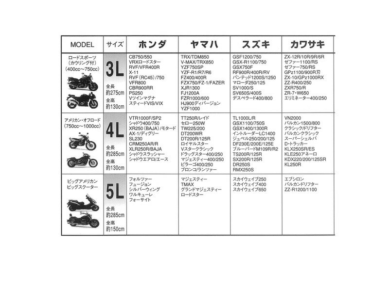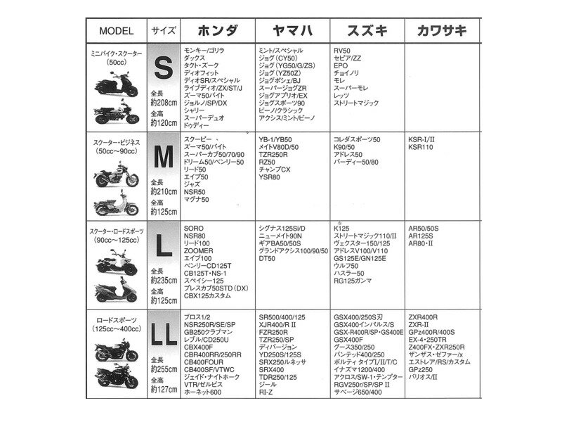 単車カバーLL〜Sのお好きなサイズをお選び下さい。 どのサイズも同じ価格のバイクカバーです。 ●ビッグスクーターは適応されませんのでご注意ください。 ●オフロードやアメリカン等の特殊車種、カウル付きの車体(カウルの大きさ)や年式等によっては適応しないものがありますのでご了承ください。 ●バイクは車種により車体の形が大きく変わり、全長・全幅・全高の比率も様々ですので、全長等の表示はあくまでも目安です...