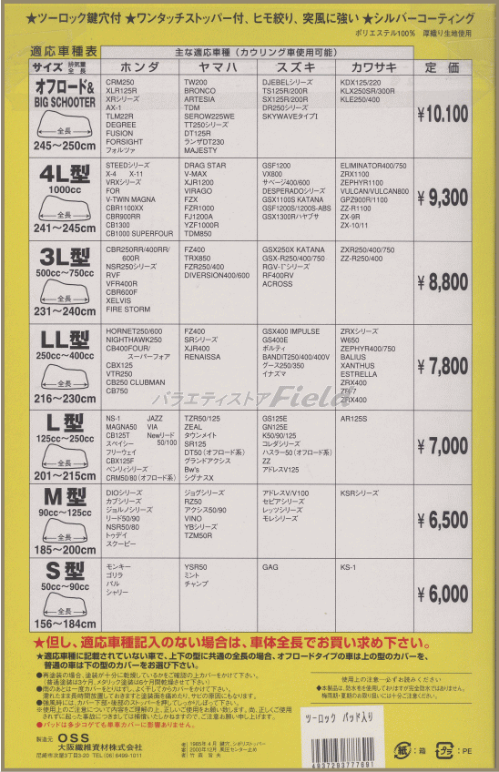 特殊裁断により縫い目が少なく、天井部に横向きの縫い目を設けない事により、雨水の侵入をより強力に防ぎます。絆の国「日本」で生まれた長年の経験から培われた、熟練の技術と知識が込められたバイクカバーです。 ◆厚手シルバーオックス アクリル樹脂加工 撥水・防水布使用 ◆大型チェーンロック対応スリット装備(前後) ◆結露対策ベンチレーション装備 ◆バックル付ストッパーベルト装備 ◆収納袋付属 ◆日本製【主な...